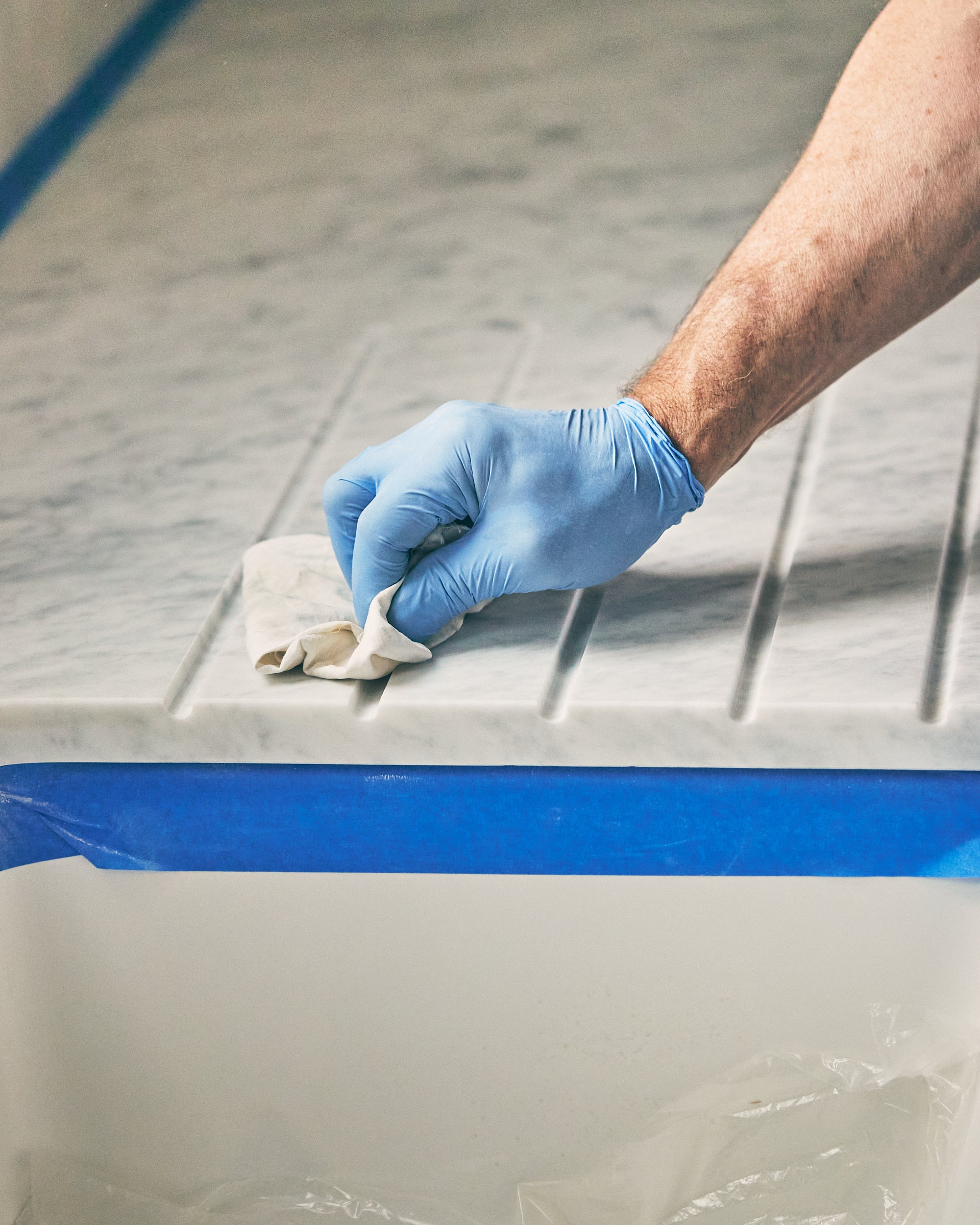 AntiEtch® is cured with a specialized UV light before the countertops are repolished to the client's desired finish, either honed or glossy.