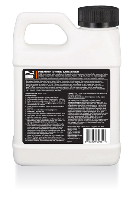 The MORE® Premium Stone Enhancer deepens color and enriches the natural beauty of stone surfaces while providing long lasting protection against oil and water-based stains. Ideal for indoor and outdoor use, it combines aesthetic enhancement with premium sealing performance.