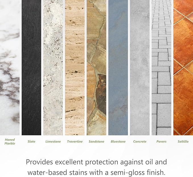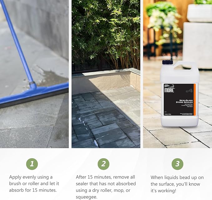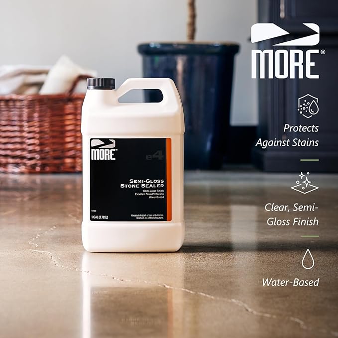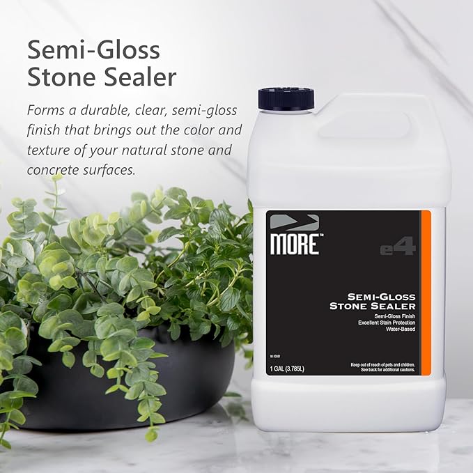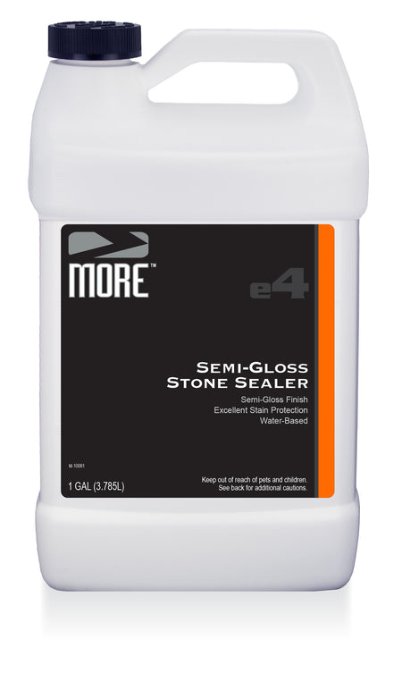 The MORE® Semi-Gloss Stone Sealer enhances the natural beauty of stone with a subtle sheen and protects against water and oil-based stains all in one water-based formula. Enhances the natural color, texture, and unique character of natural stone and concrete surfaces, providing a clear semi-gloss, "wet look" finish. It offers excellent stain protection for both indoor and outdoor applications, creating a soft sheen.