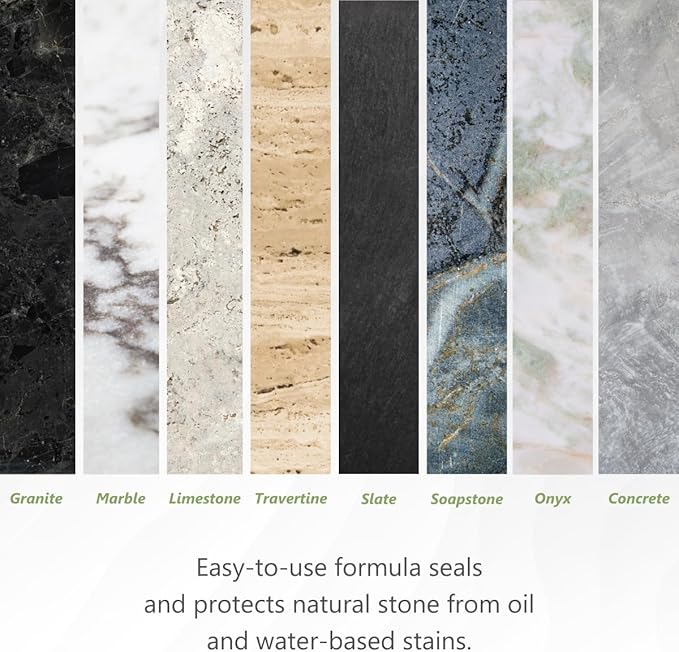 A penetrating natural-look stone sealer that provides excellent stain protection. All of our sealers are water-based so they are safer for you, your family, and the planet. Perfect for exterior and interior stone countertops, patios, walls, and floors. Use on granite, limestone, marble, travertine, quartzite, bluestone, slate, concrete, onyx, concrete, cement tile, and other natural stone.