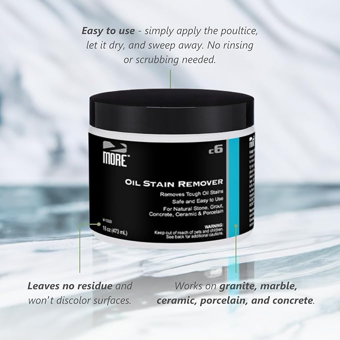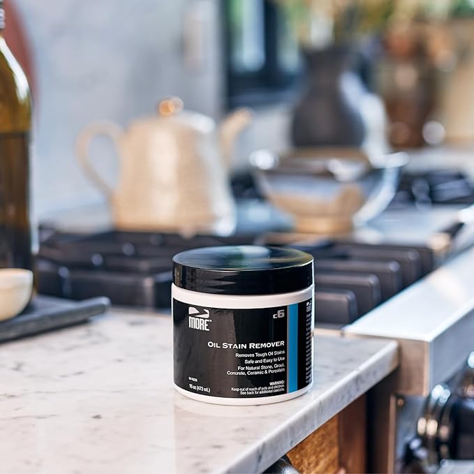 MORE® Oil Stain Remover is a poultice-based cleaner designed to extract deep-set oil stains from porous surfaces such as natural stone, grout, ceramic, porcelain, and concrete. It effectively lifts embedded oils without leaving residue or causing discoloration, making it suitable for both indoor and outdoor applications.