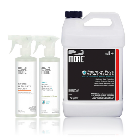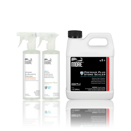 Our most advanced consumer countertop care system, designed for homeowners who want the highest level of long-term surface protection available outside of our permanent treatment systems such as AntiEtch® and Infinity Lifetime Warranty solutions. Built around MORE® Premium Plus Stone Sealer with antimicrobial protection, this complete kit helps defend against stains, preserve surface clarity, and simplify routine care for natural stone and solid surface countertops.